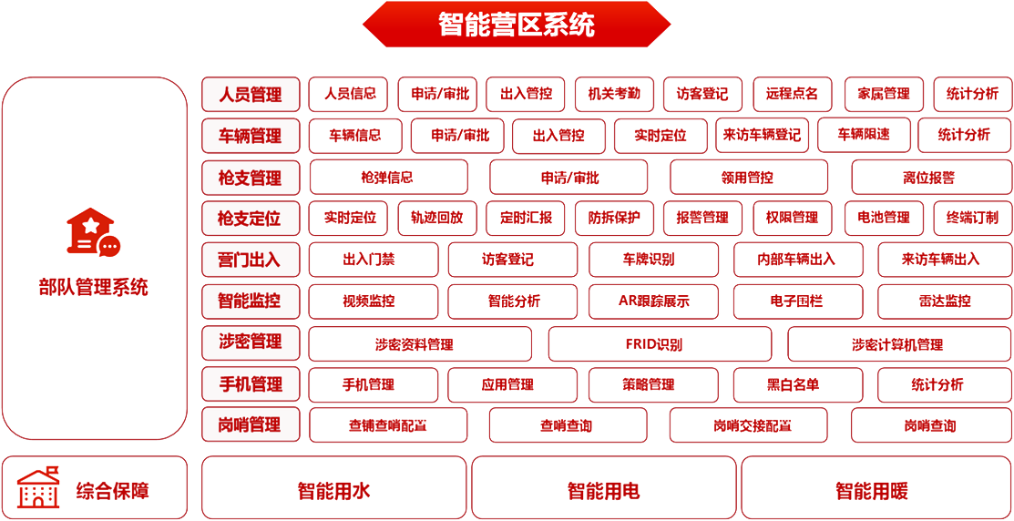 部隊管理系統基于對營區內人、車、dy、崗哨等建設要求,結合軍隊自身特點及應用現狀,實現網絡化管理,提高人、車等管理的效率??梢蕴岣唔憫芰?,構建人、車、q、d、密的全方位綜合管理的部隊系統,保障整體系統高效、穩定、安全運行,提升部隊全面信息化建設層次